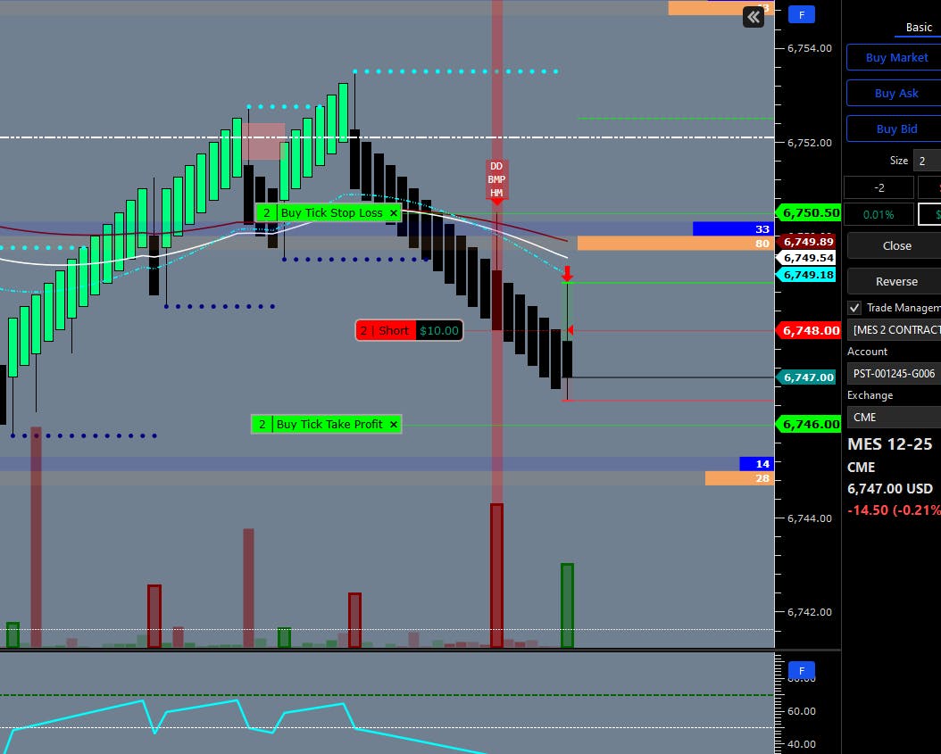 Went short here on MES. Full wick pullback to strike level. 3 signals short. Popped so fast I didnt have a chance to move TP down to next strike. 2 points anyway but damn look at the drop after that