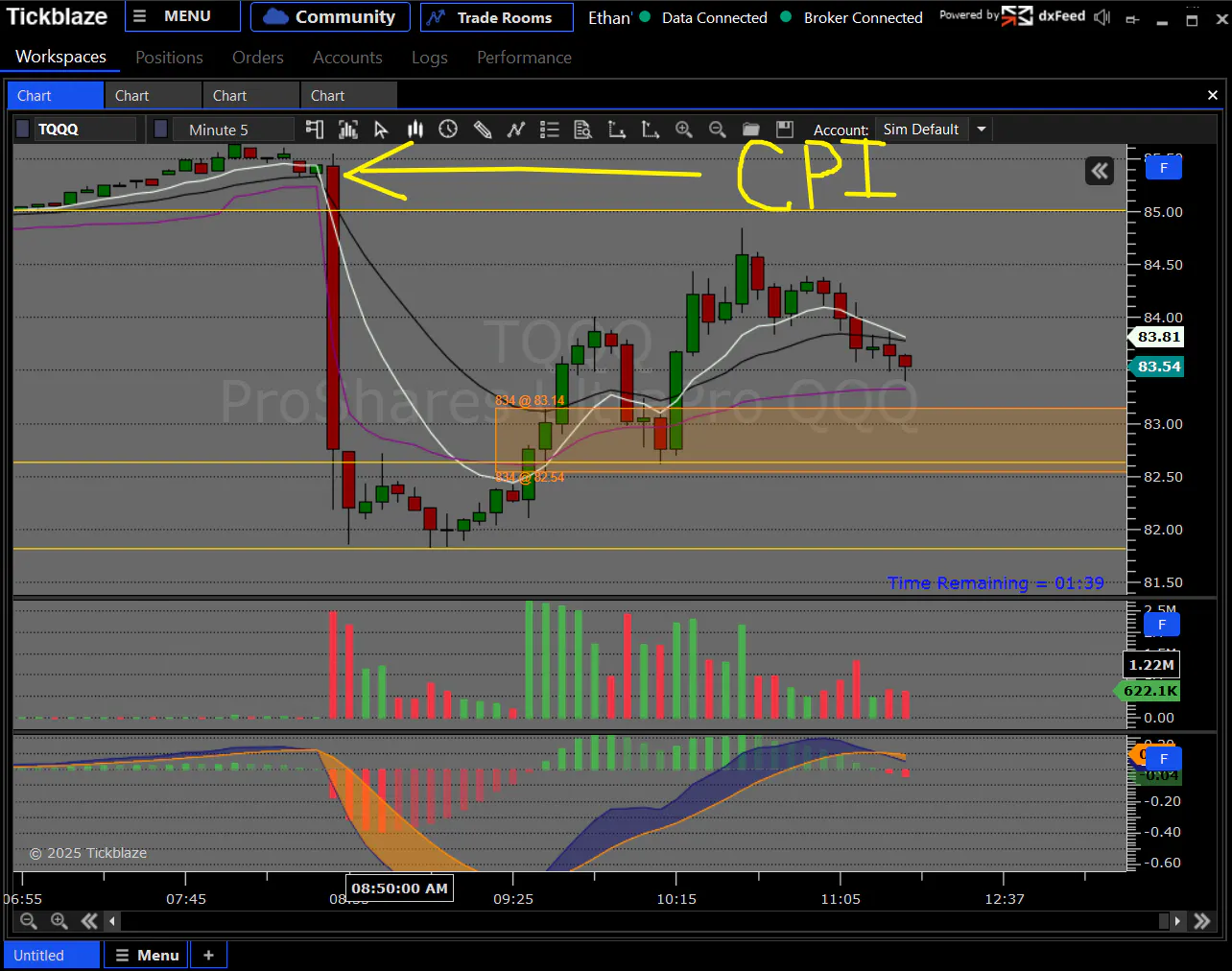 8:30 AM: CPI is higher than expected, SPY drops hard, TQQQ dumps.